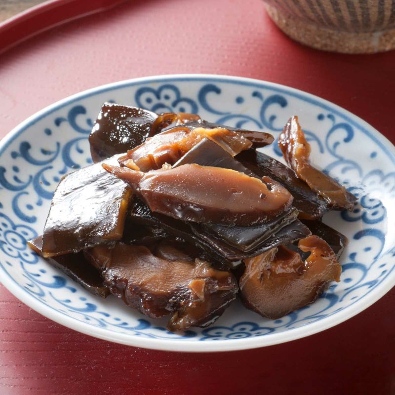 ミネラルなどが豊富な昆布と干し椎茸をじっくり柔らかく煮あげ、仕上げに山椒の香りを利かせました。